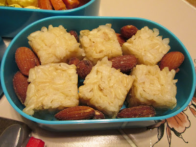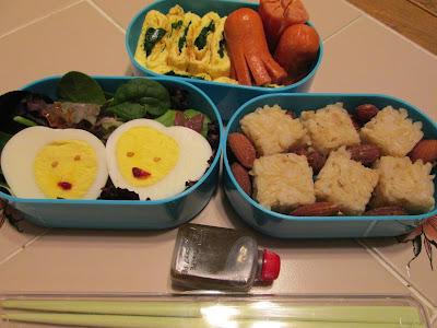 Here it is! I hope she likes it. :) I used some of my new bento goodies from Christmas to make this bento. The 3 tiered Blue Bento box, the Cube Rice Shaper, and some of my Crystal Food Picks.